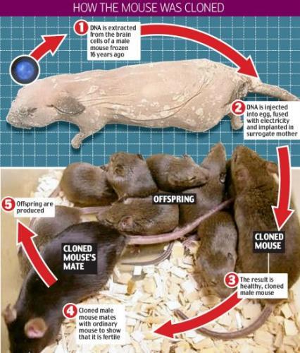 英国生物学家马尔科姆-艾莉森教授认为,“利用冰冻了16年之久的老鼠细胞克隆出新的生命,这与当年多莉出生采用的是同样技术。但为什么一些灭绝动物不能同样克隆呢,科学家们一直未能找到原因。”克隆冷冻鼠的实验由日本神户发育生物学研究中心若山照彦博士等科学家具体实施。他们从一只普通的雄性死亡老鼠的身上提取脑细胞并剥离出细胞核。然后,将剥离出来的细胞核与一个卵细胞结合,完成人工受精。当卵细胞受电流激活后,开始分裂并长成一个新生命胚胎。数日后,胚胎被置入代孕雌鼠的子宫之内。三周后克隆幼鼠出生。据研究人员介绍,这些克隆幼鼠并未出现任何畸形,而且已进入成年期。