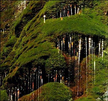 “湖北南漳县有一个最为奇特的瀑布,国内罕见,堪称世界奇观。”湖北地质遗迹调查评价中心的调查报告中这样称呼南漳香水河“ 七彩瀑”。这个40米高,坡度达70多度的瀑布,面向东南方,晴天上午九点到十一点钟,太阳射在瀑布水珠上,如果我们站在瀑布下一个合适的位置,就能看到瀑布上许多闪烁的彩色光珠,像一串串彩色星星灯,随风飘扬。红灯灭了,绿灯亮了;绿灯灭了,又换成黄灯,不断变化。水量越大,彩珠越明显。瀑布下常常能看到七色彩虹,但像这样的七彩光珠倒是闻所未闻。