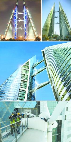 迪拜的巴林世贸中心由两个锥形高塔组成,连接高塔的巨桥装有3个大型风轮机。高塔锥形设计能让风高速从塔的中间穿过,产生最多电力。