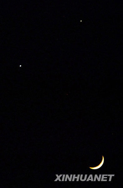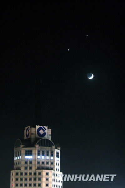 据天文学家解释,这是金星和木星围绕在月亮周围而形成的天文景象,只要天气晴朗,全国各地乃至东半球大部分地区都可以观赏到该天象奇观。