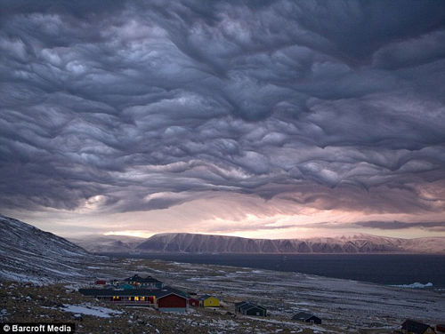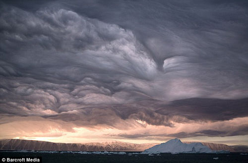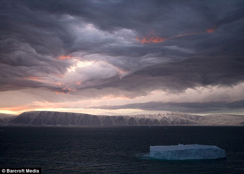 据英国《每日邮报》报道,英国北极摄影师布赖恩和谢利·亚历山大在格陵兰西北拍下天空中惊人美丽的风暴云。这些照片看起来像是世界终结的景象而不是冬天里的日出场面。