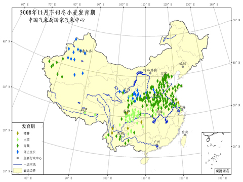 目前,我国冬麦主产区的冬小麦生长正处出苗期和分蘖期(如图1)。农业气象学的研究表明,北方冬麦区日平均气温稳定降至0℃以下时,冬小麦停止生长进入越冬期,在初冬冻之前,气温逐渐降低,麦苗经过5 ~ 0℃和0 ~ -5℃的低温锻炼后,小麦抗寒能力增强。但是入冬前后若遇剧烈降温或冬末春初的强烈冻融,都将造成小麦冻害的发生。今年北方大部小麦长势普遍较好,冬前基本形成壮苗,此次降温过程可能对其影响不大;但黄淮、江淮部分地区冬小麦发育期偏晚,冬前积温不足,苗情偏弱,强降温过程会导致部分冬小麦减缓生育进程,麦苗营养积累少,不利于长叶扎根,威胁小麦安全越冬。 因此各地要根据苗情、墒情,适时浇灌越冬水,并采取破埂盖土等防寒保苗措施,确保冬小麦安全越冬;华北南部、黄淮要做好麦田肥水管理,促进冬前形成足够的有效分蘖;对有旺长趋势的麦田,要注意深耕,控制无效分蘖。