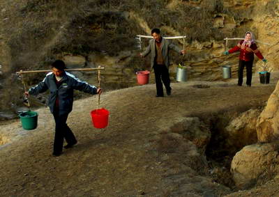 2月18日凌晨4时,会宁县八里湾乡芦坪村67岁的陈学仁挑着两只水桶出门了。家里的两眼水窖早在10天前就已干了,陈学仁不得不去5公里外大沟乡同干村的一处山泉挑水。一个多小时后,翻过两座山后他到达了目的地,一条山沟底部的一个直径约1.5米、深约1米的小水坑,里面有个泉眼在往外渗水。山泉边已摆放着6只水桶,有3位村民已在此排队了。由于干旱,山泉的出水量已经越来越小,渗出一桶水至少需要等半个小时。4个小时后,陈学仁的两只水桶终于盛满了。回来的路上陈学仁歇歇停停走了两个多小时,到家时已是中午12时了。陈学仁寻思,明天得早点出门,否则天黑还挑不回一担水。