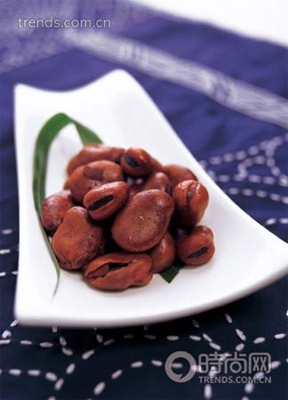 典型的绍兴小食。茴香豆用干蚕豆做原料,拣去变色虫蛀的劣豆,在水中浸泡沥干。入锅后加适量的水,用急火约煮15分钟。掀开锅盖,见豆皮周缘皱凸,中间凹陷,就马上加入茴香、桂皮、食盐(或用酱油)和食用山萘,再用文火慢煮,使调味品从表皮渗透至豆肉中,待水分基本煮干后,离火揭盖冷却即成。