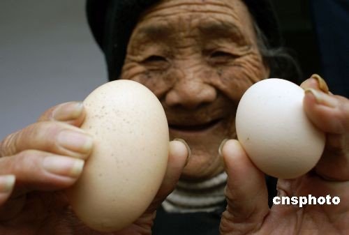 2月24日,山东省枣庄市山亭区北庄镇后峪村76岁老人秦传兰家的一只母鸡产下一枚重127克的巨型蛋,该鸡蛋长约8厘米,重127克,有3个普通鸡蛋大。中新社发 王森王 摄