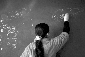 2月26日,三间房乡宏翔学校一间教室内,一名五年级女生在黑板上画着哭泣的表情。她所在的学校当日早上被所属地的村委会责令停课。本报记者 杨杰 摄