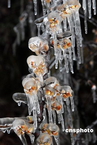 中新网3月2日报道三月一日,江西庐山出现冻雨现象并形成雨淞景观。满山树木千枝万叶裹上了厚厚的冰层,玲珑浸透晶莹闪亮。据了解,此次雨凇厚达20毫米,形成多年不遇的独特景观。雨凇是指超冷却的降水碰到温度等于或低于零摄氏度的物体表面时所形成玻璃状的透明或无光泽的冰覆盖层。