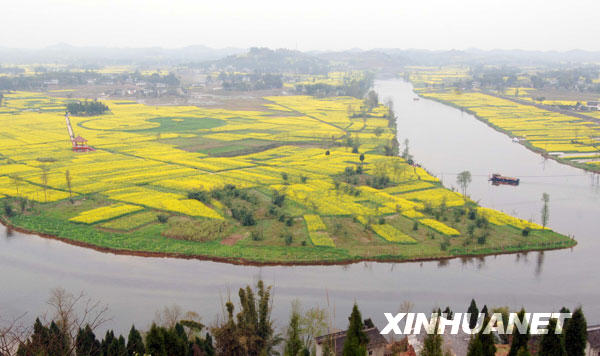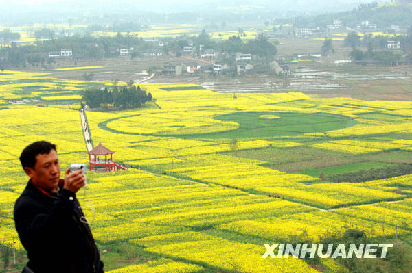 首次在菜花节上亮相的巨型菜花“太极”图远眺(3月5日摄)。新华社记者刘潺摄