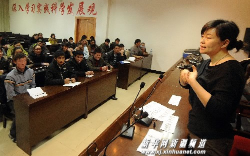 3月9日,在布尔津县综合培训中心,哈萨克族牧民子女在听取礼仪服务理念课程。