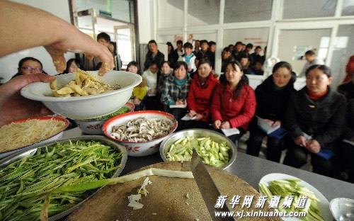 3月9日,在布尔津县综合培训中心,哈萨克族牧民子女在学习烹饪技术。