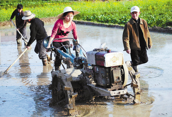 3月9 日,诸暨市季东村的大学毕业生季萍在耕田。季萍毕业于中国农大,她希望发挥所学之长,与爸爸(右一)一起种田,当一位新型农民。今年季萍家承包了300多亩粮田。(浙江日报记者 黄曙林 诸暨日报记者 徐德文 翁均飞 摄)