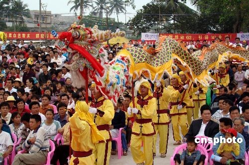 三月十日农历二月十四日,是海南澄迈县加乐镇农民的传统节日“公期”,当地农民们聚集一起,有的参加恩爱夫妻奔小康比赛,有的参加琼剧表演、歌唱比赛,还有的参加书画比赛。“公期”是海南琼北地区的一种地方传统习俗,也叫军坡节,是一种祭神活动。图为农民舞龙欢庆传统节日。 中新社发 付美斌 摄