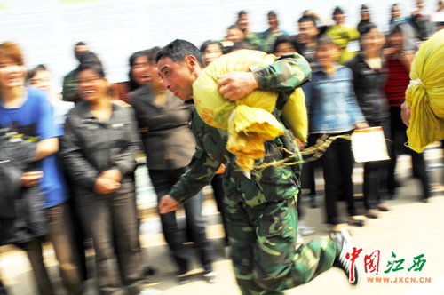 抗洪抢险扛沙袋比赛。(江西网记者 邓小勇 摄)
