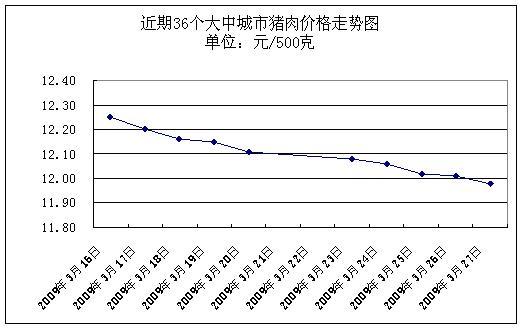 中新网3月30日电据国家发展改革委价格监测中心监测,上周(2009.3.23-2009.3.27,下同)36个大中城市集市、超市猪肉(精瘦肉)平均零售价格每500 克为12.03元,与前一周(2009.3.16-2009.3.20,下同)相比下降1.15%。