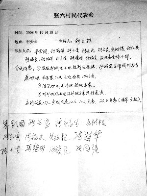一份村民代表会议记录上的签名,代表说是签到证明,镇领导说是表决签名