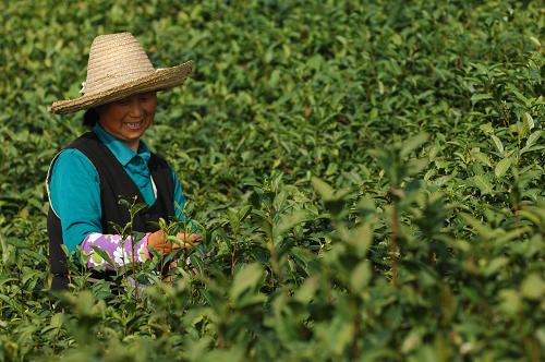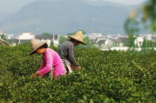 安徽歙县棠樾村村民在采摘春茶(4月23日摄)。近日,记者从农业部了解到,我国茶叶产销在连续5年增长10%左右的基础上,今年开局良好,春茶产销两旺,全年有望又有一个好收成。若无大的自然灾害,预计今年全国春茶总产量50万吨左右,比去年增产8%。新华社记者李健摄