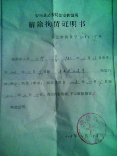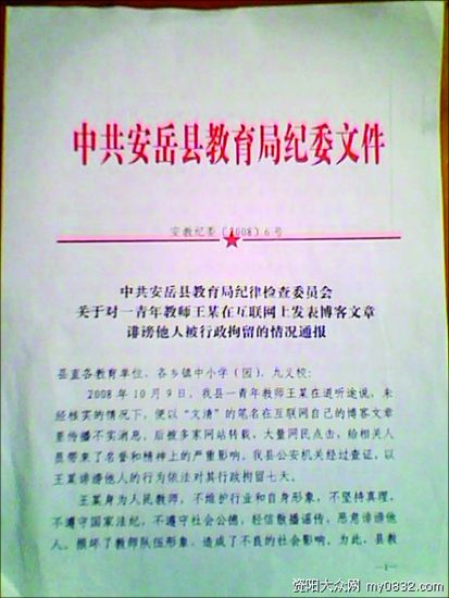 据悉,在“求助信”中称,申诉人名叫王帅,职业为教师,四川安岳县人。帖中介绍说,2008年10月17日上午,申诉人被传唤至乡政府,接受便衣警察询问,并于当天下午“在没有出示任何手续的情况下,将我和学校的电脑扣押,来到安岳县岳城刑警中队,便开始反反复复对我进行笔录询问,一直到晚上8点过,最后以‘涉嫌诽谤’的罪名将我行政拘留7天”。