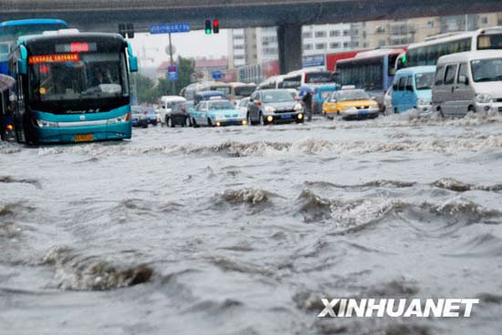 5月10日,在山东济南市长途汽车站附近街头,车辆在积水中行进。新华社发(高原 摄)