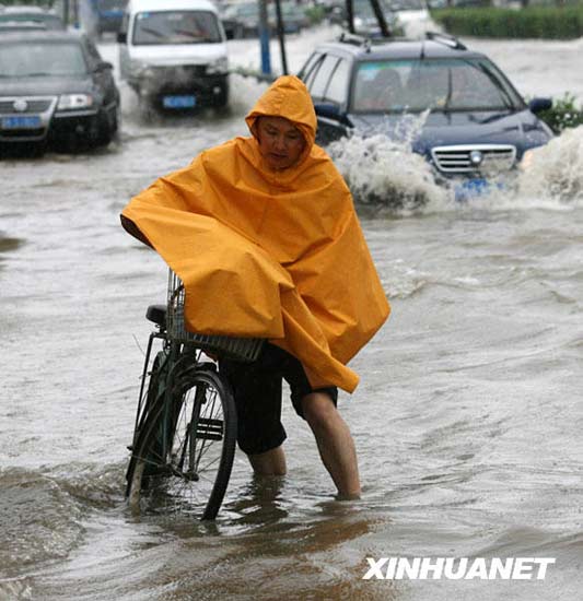 5月10日,在济南街头,行人和车辆在积水中小心前行。新华社发(吕传泉 摄)