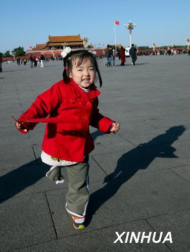 10月26日,来自四川地震灾区的3岁女孩宋馨懿在北京天安门广场玩耍。