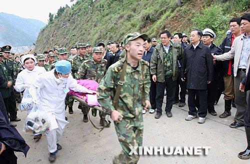 5月14日,国务院总理温家宝抵达地震重灾区四川北川县察看灾情。这是温家宝在距北川县县城仅两公里的曲山镇察看灾情时,几名战士抬着一个小女孩从县城方向跑过来,温家宝和随行人员赶紧让路。温家宝说,时间就是生命,要尽全力救人。新华社记者姚大伟摄