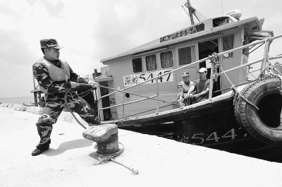 5月14日,深圳边防支队蛇口工作站官兵帮助回港渔船停靠码头。根据农业部的部署,今年南海伏季休渔制度进行了大幅调整,比往年提前了半个月,即从5月16日12时至8月1日12时。