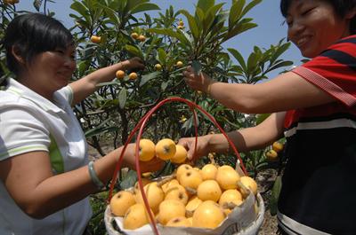 5月15日,浙江省台州市路桥区绿园果品合作社社员在采摘枇杷。当日,果农们纷纷上山开始采摘成熟的枇杷。据悉,路桥区桐屿是“中国枇杷之乡”,枇杷种植面积达8000多亩,年产量超4000吨,占全国总产量的百分之二十五。果农们依靠科学管理,株株枇杷果实累累,今年预计总产超出往年2成以上,价格也普遍高于去年。 王保初 摄
