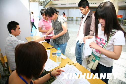 5月18日,一些应届大学毕业生在怀柔区“村官”报名现场报名。 北京市怀柔区、门头沟区等区县近日启动面向2009届高校毕业生党支部书记助理、村主任助理招聘考试工作,报考的大学毕业生经初审、笔试、面试等程序考核合格受聘后将到各区县走上“村官”岗位。新华社发 卜向东 摄