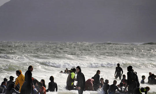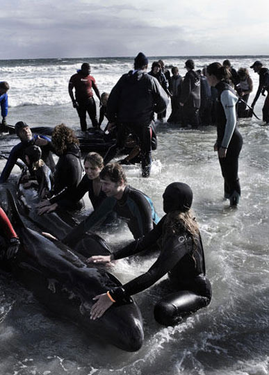 5月30日,在南非开普敦附近的科梅奇海滩,专业救援人员和志愿者试图将搁浅的巨头鲸推回水中。当天上午,数十头巨头鲸在此搁浅,但在人们的帮助下它们又回到了大海。