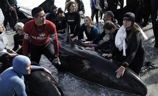 专业救援人员和志愿者帮助巨头鲸回到大海