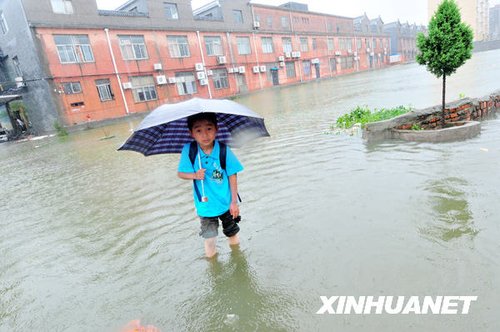 6月2日,一名儿童从南昌市何兴村积水处走过。