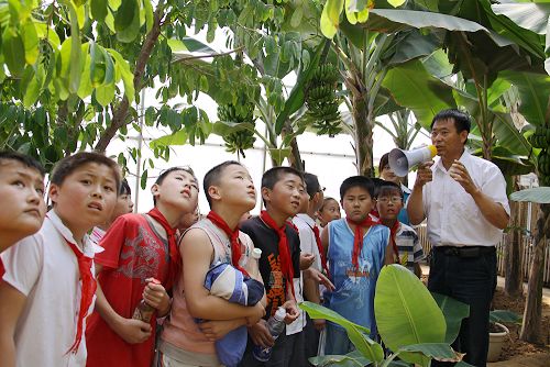 5月31日,河北省秦皇岛市妇联、教育局、科协联合确定的全市“儿童现代农业科技教育基地”在北戴河集发生态农业观光园授牌成立,并为200名学生颁发了“儿童现代农业科技教育基地”学员联系卡。图为辅导员为小学员们讲解热带植物北方温室大棚生长过程。