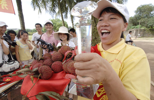 6月9日,海口市永兴社区农民王金玉在展示荔枝皇帝。当日,海南省海口市举行了第三届秀英区永兴荔枝文化节,永兴社区农民王金玉种植的荔枝和永兴社区农民王保吉种植的黄皮,因为口感好、肉质佳、外观靓,被评选为“荔枝王”和“黄皮王”。