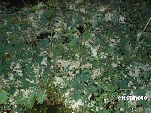 6月14日晚,河南省开封市西司桥下种植的观赏莲藕被冰雹打的满目疮痍。6月14日下午6时20分许,河南省开封市随着一场强降雨,持续20分钟的冰雹袭击古城,市区的环境设施和周边的农作物受到严重破坏。 中新社发 凯枫 摄