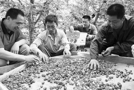 樱桃红了,农民笑了。河南省汤阴县古贤乡古贤村科技致富能手王新红种植的樱桃喜获丰收。在村党支部和专业合作社的帮助下,种了10亩樱桃,亩产达到2000斤,净收入近20万元。图为村民在樱桃园内筛选樱桃,装箱外销。张志勇 田锐勋摄