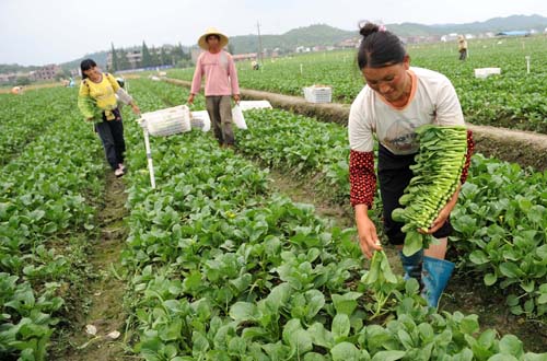 6月18日,陇田村蔬菜基地的菜农在收获蔬菜。近年来,江西省芦溪县银河镇陇田村发挥交通和自然气候的有利条件,建立供应香港蔬菜基地,按照“公司+基地+农户”的发展模式,实行新型定单农业。目前,该村供港蔬菜基地已发展到2000多亩,全年实现销售收入达3000余万元。