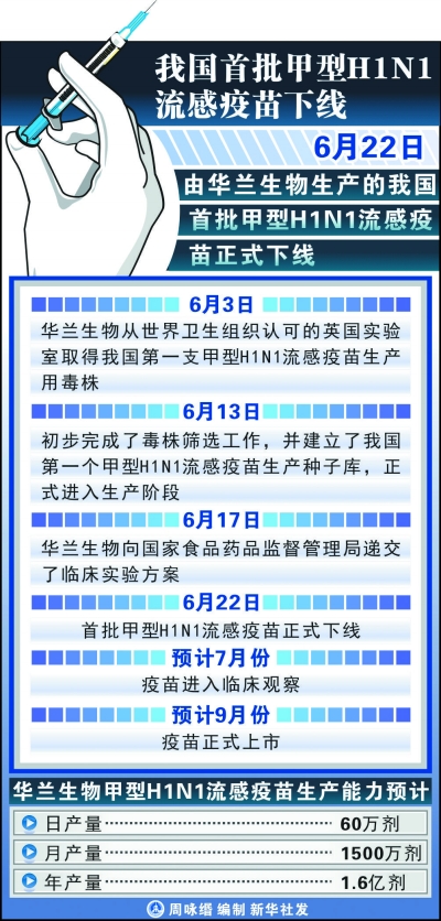 6月22日,我国首批甲型H1N1流感疫苗在河南生产下线。这批疫苗是由华兰生物公司研制生产的。