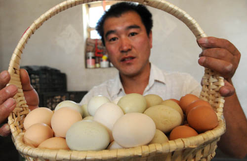 6月24日,在河北省尚义县红土梁镇,王剑峰展示五彩鸡蛋。河北省尚义县红土梁镇村民王剑峰,从2006年开始从全国多个地方引进白壳鸡、褐壳鸡、粉壳鸡、绿壳鸡及土鸡品种,生产出白色、红色、粉红、绿色、浅绿五种颜色的鸡蛋组合在一起销售。目前,王剑峰共养殖五彩蛋鸡2000只,年产量约3万公斤,年收入可达20万元以上。