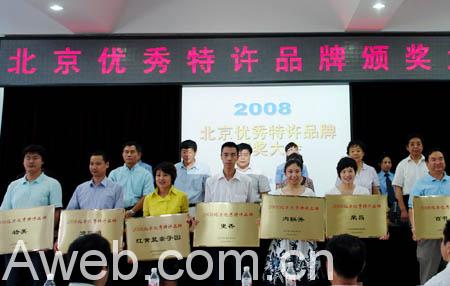 为推动本市特许经营企业的体系建设,促进行业健康发展,6月24日下午,北京市连锁经营协会在超市发连锁培训中心,主办召开了“2008年北京优秀特许品牌”颁奖大会。会上,北京市连锁经营协会副会长李秀珍、市商务委领导分别作了讲话。全聚德、更香茶叶、同仁堂、东来顺、物美等北京知名品牌荣获了“2008年北京优秀特许品牌”奖。其中更香茶叶公司顺义店及酒仙桥店被评为2008年北京优秀加盟商。