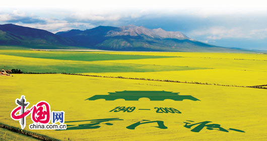 继2008年成功种植“奥运五环”、“2008”、“金门源”大地艺术图案后,今年青海门源县以新中国成立60周年为契机,投资30万元种植展示迎国庆大地艺术图案,成为2009年油菜花旅游节的一大亮点。
