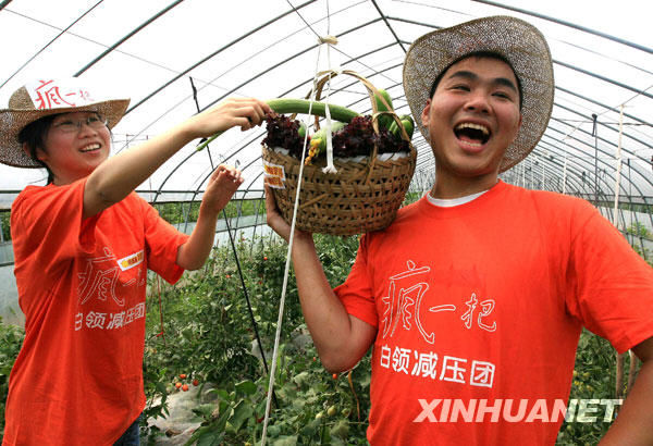 7月6日,在上海工作的张帅(右)和同伴喜收他们自己种植的蔬菜。近期以来,不少上海的年轻人在郊区租种菜地,并在闲暇时结伴到郊外收获自己的劳动成果,这种休闲方式成为许多上班族平衡生活、释放压力的一种选择。新华社记者陈飞 摄