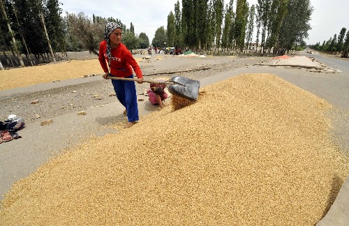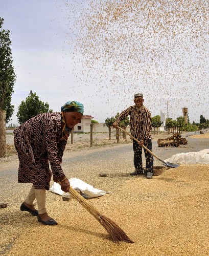 7月12日,拜城县赛里木镇的维吾尔族农民在晾晒新收获的小麦。新疆拜城县是国家优质商品粮基地县、全国粮食生产先进县。国家的粮食补贴政策提高了维吾尔族农民种粮的积极性,2009年全县小麦种植面积达19万多亩,平均亩产达423公斤,当地维吾尔族农民获得良好经济效益。 新华社记者 沈桥 摄