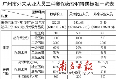 广州将大幅降低外来从业人员医保缴费!昨日,专门为广州160万外来工“量身订做”的医保办法正式出台,用人单位月缴55元,个人无需缴费便可享受普通门诊待遇,且一年最高可报销29.5万元(待遇标准详见附表)。外来从业人员医保办法从8月1日起施行,新参保的外来从业人员,在8月办理手续后,9月缴费,因此最早10月才能享受医保待遇;而已参加了城镇职工基本医疗保险或灵活就业人员医疗保险人员,可省去参保登记这一流程,8月办理转换手续后,9月开始按照外来从业人员基本医保享受待遇。