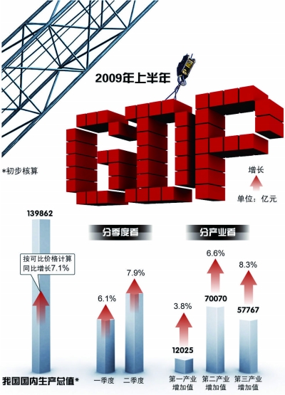 2009年上半年宏观数据昨日悉数亮相,上半年国内生产总值139862亿元,同比增长7.1%,其中,一季度增长6.1%,二季度增长7.9%。居民消费价格同比下降1.1%,工业品出厂价格同比降幅较大,达5.9%。国家统计局新闻发言人李晓超称,今年以来,中央应对国际金融危机、保持经济平稳较快发展的一揽子计划效果明显,经济运行中积极因素不断增多,国民经济企稳回升。