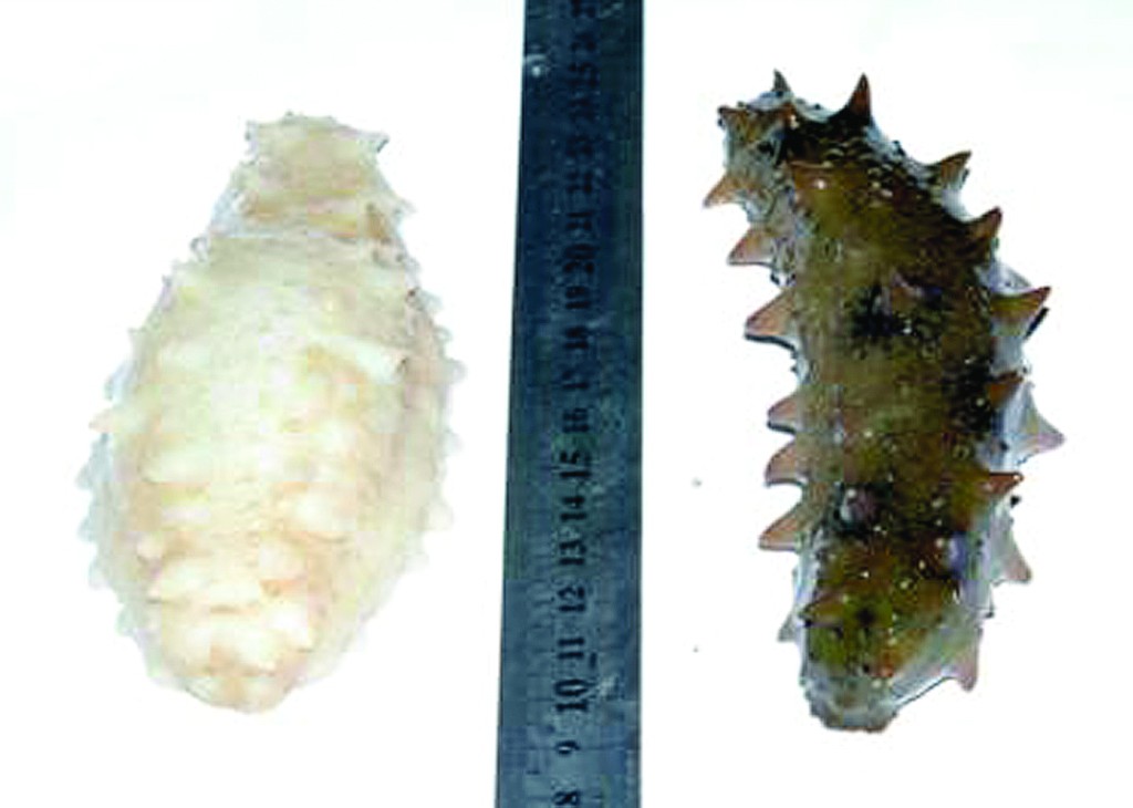 实验显示,即使实验对象是黄褐色或栗子褐色的普通刺参,通过人工刺激繁殖,其色素也出现了明显的沉积,发育成了“变色参”,与原来的体色出入较大,甚至有被“漂白”的可能。专家表示,这意味着通过基因控制为刺参改“肤色”取得成功。