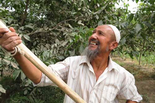 7月19日,叶城县依提木孔乡的肉孜·依明在自家核桃园里修剪树枝。地处塔里木盆地西南的新疆叶城县自2005年依托资源优势实施“一乡一果”战略以来,大力发展核桃、石榴和优质杏的种植。2008年,全县80万亩林果总产量近20万吨,实现产值6.64亿元,农民人均收入1058元,铺就了农民增收致富路。 新华社记者周文杰摄