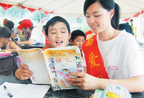 7月20日,江苏科技大学张家港校区的10多名大学生志愿者来到四川省北川羌族自治县永安镇帐篷小学,开展“让快乐伴我成长”夏令营活动,大学生们义务辅导这里的小学生读书学习、学跳拉丁舞等,带着孩子们快乐度暑假。图为江苏科技大学的学生正在指导帐篷小学的学生复习功课。
