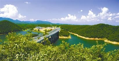 图为:万倾碧波的封江水库是度假消暑的好去处