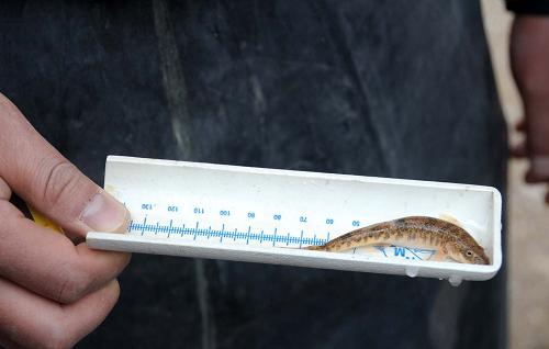 在长江源头支流唐古拉河畔,科考队员对打捞上来的唐古拉高原鳅进行体长测量(7月26日摄)。新华社记者 杨金志 摄