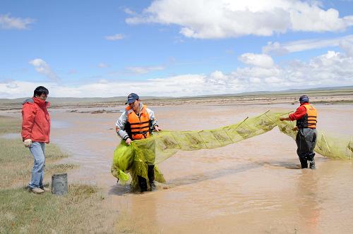 科考队员正在进行高原鱼类的打捞作业(7月26日摄)。新华社记者 杨金志 摄